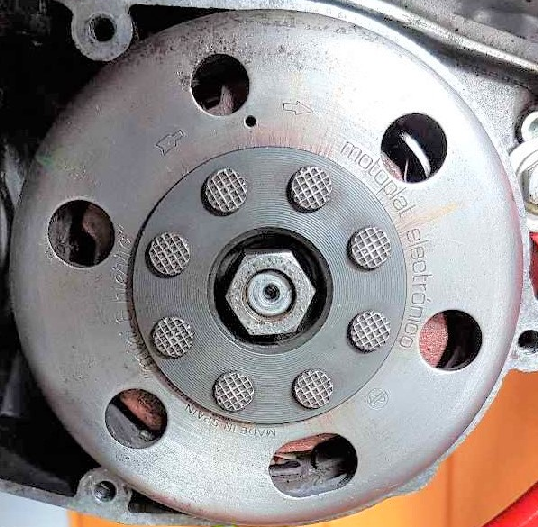Nachdem ich damit zufrieden war, hab ich die Rotormarkierung bei OT auf die Stator-Markierung eingestellt. Das geile an der MVT ist, dass die sowohl für Rechts- wie Linkslauf ausgelegt ist und jeweils eine passende Markierung hat. Im Gegensatz zum Minarelli, Asco oder auch TR61 hat nämlich die RC125 die Zündung auf der rechten Seite und läuft auch im Uhrzeigersinn.