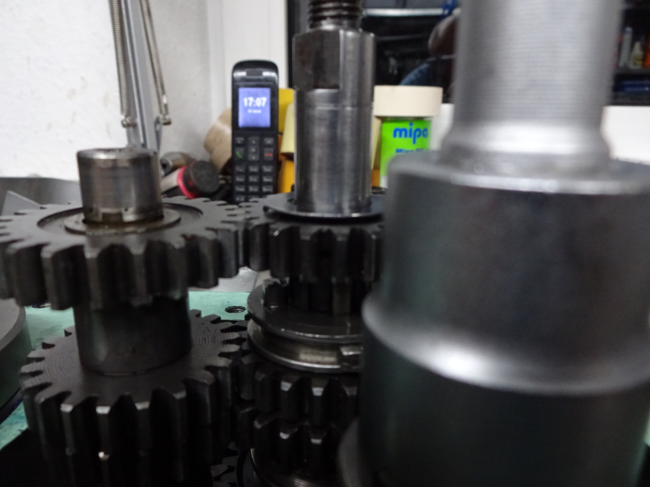 Die Getriebewelle hatte ohne irgendeine Scheibe 0,7mm Spiel, nach dem Ausgleichen 0,1mm. Ich musste aber noch mal messen und ausgleichen, manchmal klappt es nicht in einen Anlauf
