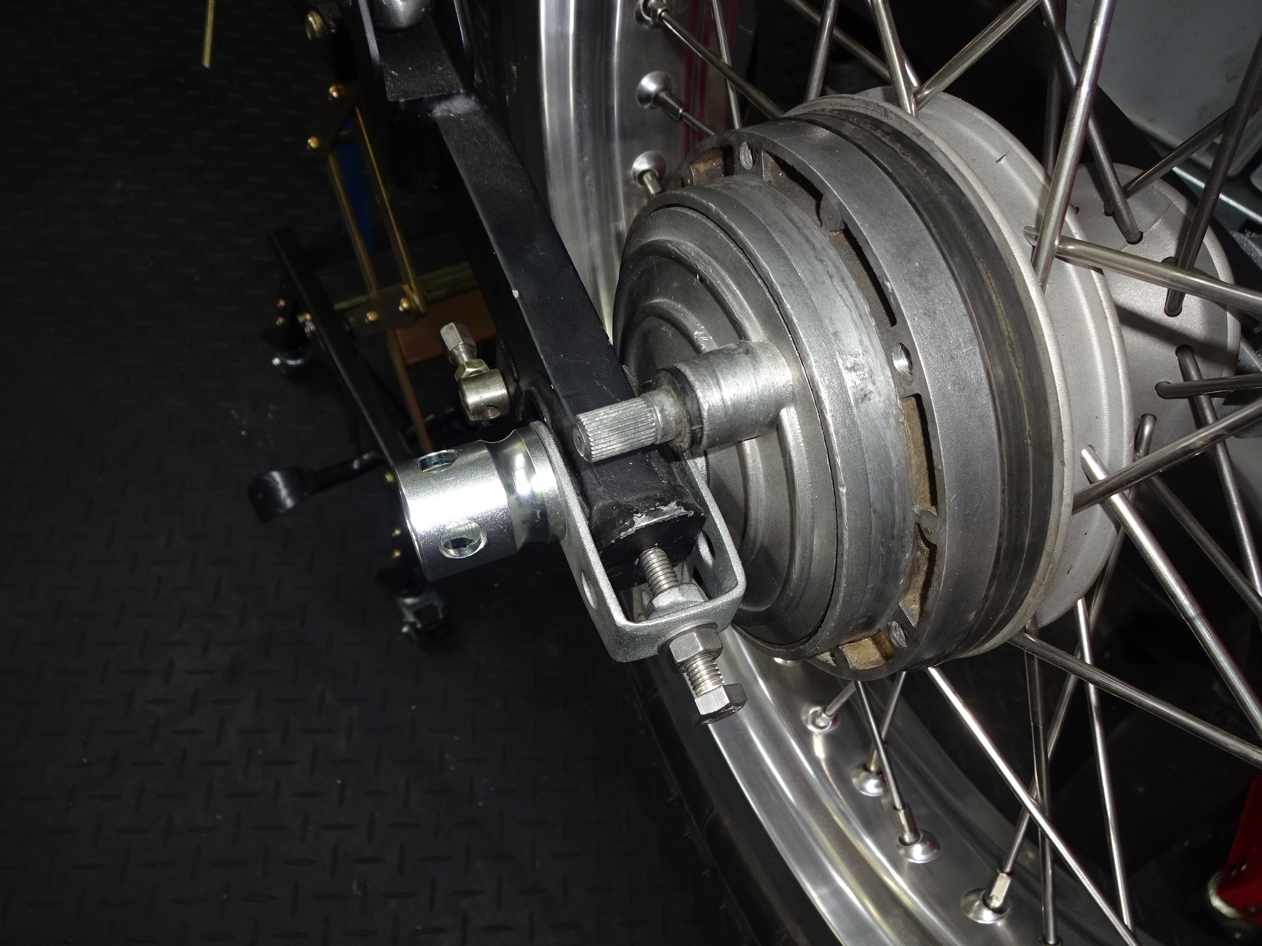 Jetzt geht das prima, alles zusammenstecken und von rechts die Achse durch Buchsen und Nabe stecken. Dann von links das kurze Achsstück inkl großer Mutter einsetzen und zusammenschrauben