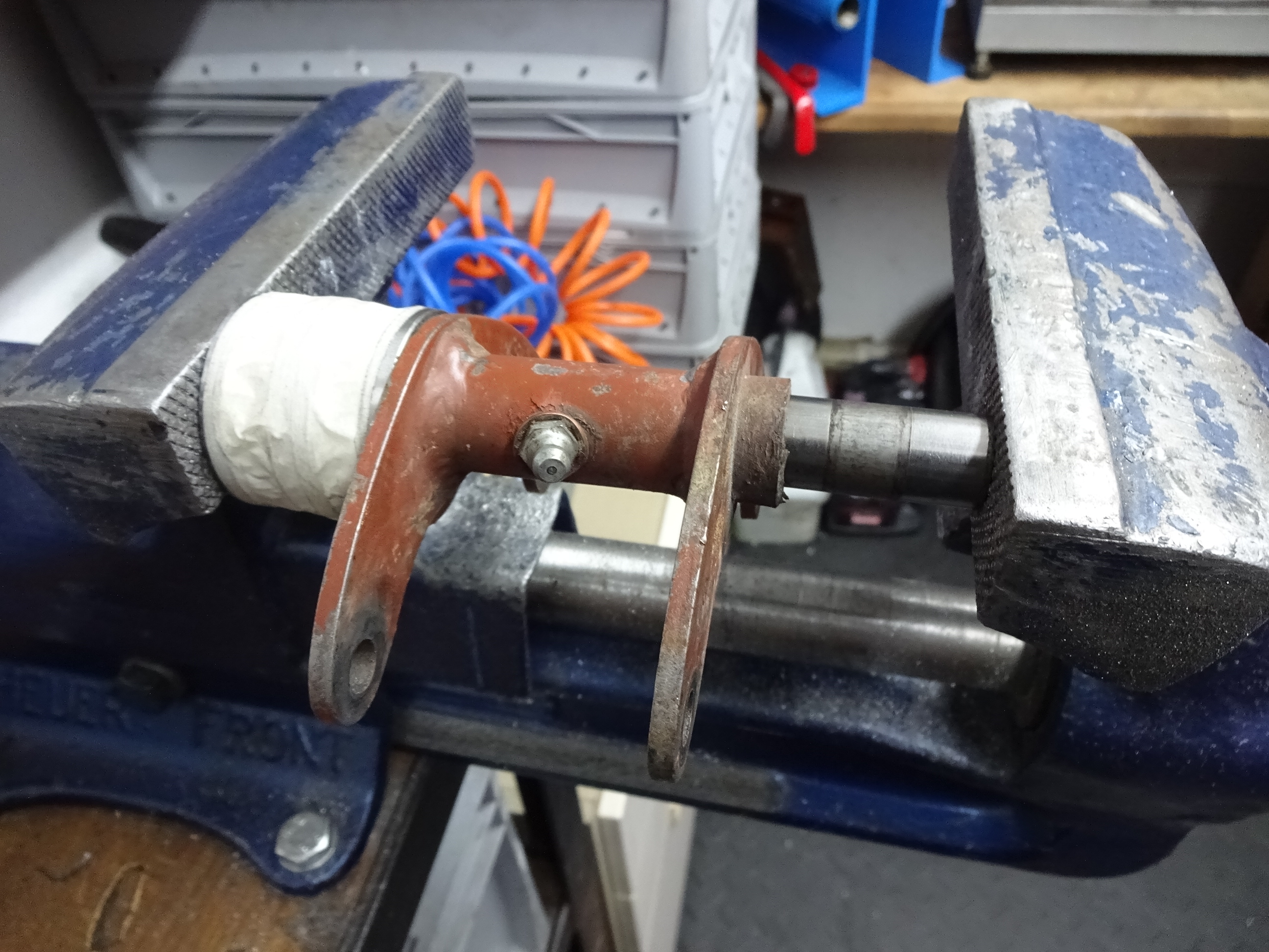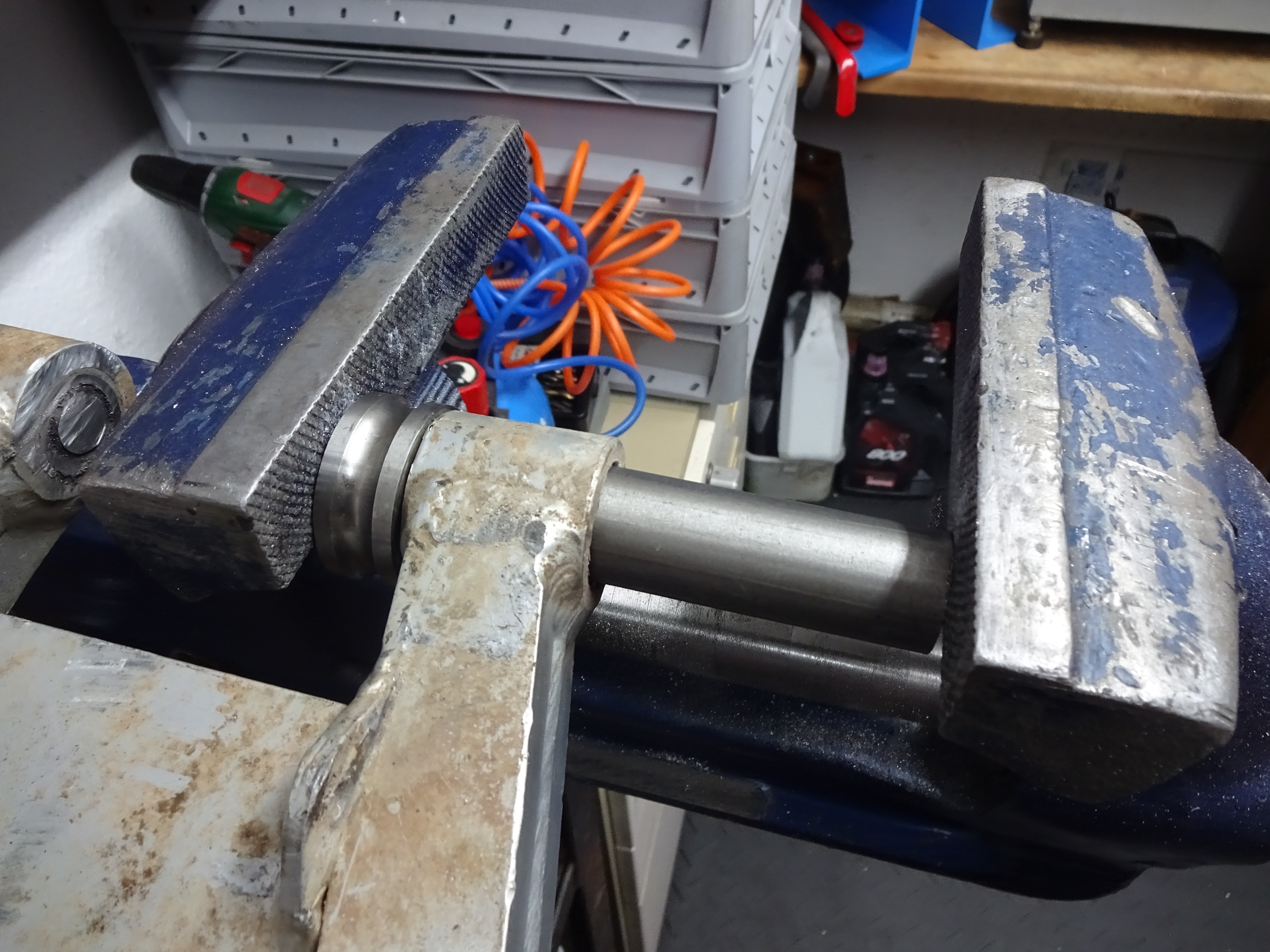 Jetzt die Silentbuchsen aus der Schwinge und die Buchse aus der Motorhalterung pressen. Der gute Heuer Front Schraubstock ist da Gold wert und den Rest auf der Presse.