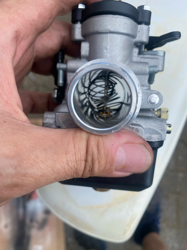 Dann habe ich aber festgestellt, dass der Ansaugtrichter vom neuen Vergaser zu groß ist für die Gummimanschette. Üblich sind 59er Außendurchmesser, die Fantic hat aber einen 52er Durchmesser. Und der originale Trichter fehlt tatsächlich! Beim mitgekauften Vergaser war auch ein 59er Trichter drauf.