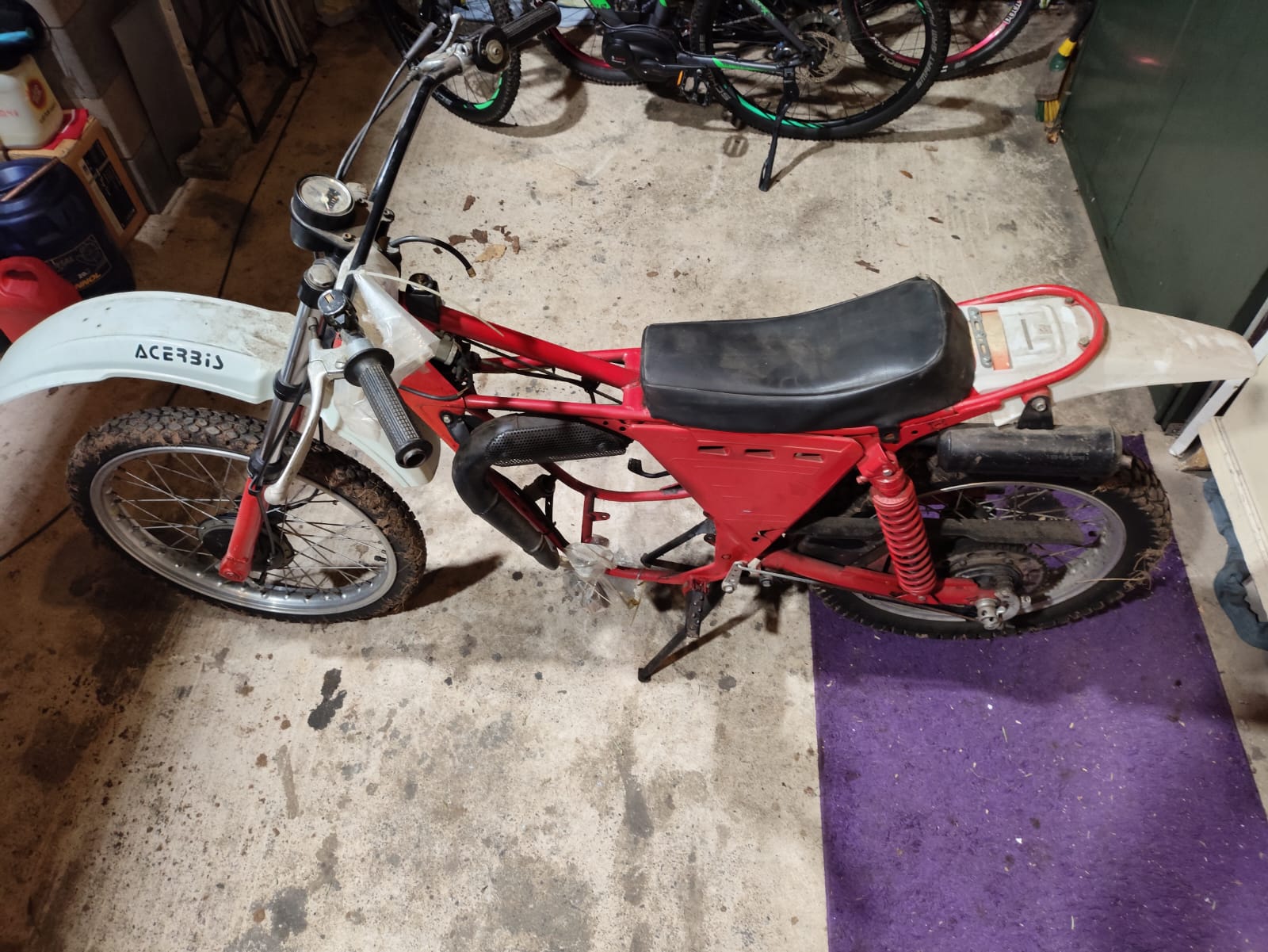 Die Fantic ist mittlerweile entkernt und die Substanz macht einen brauchbaren Eindruck, auch wenn Auspuff, Sitzbank und Tank eine ordentliche Bastelkur beim Vorbesitzer erfahren durften.