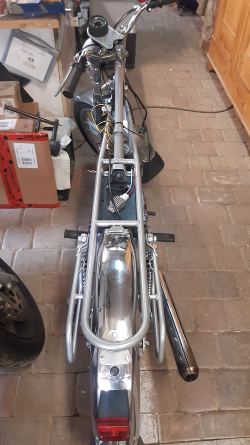 ich hab für den Bad Hersfelder Moped Marathon dann doch schnell den Corsa Corte Motor gegen einen normalen P4 mit dem 70 Kubik Polini Membranzylinder getauscht. Problem war da noch der Auspuff, also was zurechtgeschweißt und einen normalen 50er Auspuff draufgesteckt. Vergaser war der 19er drauf, den ich am Corsa Motor habe und geändert hab ich genau gar nix dran. Motor rein, Zündung vom Corsa Motor in den P4, so musste ich nix am Kabelgelerch ändern. Ritzel auch gleich, nix an der Kette geändert. Angekickt, läuft,hält Standgas, fährt. Kraft von unten raus, aber halt nur 55 Klamotten Spitze. 30 km Probefahrt, mehrmals die Kerze angekuckt. Eher zu dunkel als zu hell. Egal, besser so als oder so