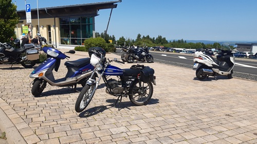 Ab hier ging es für uns aber reibungslos weiter. Kurz vor dem Mittagsziel sehen wir die Dimpels am Straßenrand stehen. Dem Max ist die Aspes verreckt. Da Sie noch keine Meldung vom Lumpensammler hatten ist Daniel dann mit uns erst einmal zum Mittagsziel gefahren und hat sich den Nudelpamp rein gezogen. Dann ist er wieder zurück um die Kinder ab zu lösen. Mittlerweile kam die Sonne schon öfter mal raus. Meine Hose war schon wieder trocken, nur die Lederjacke brauchte halt noch. Nach der Mittagspause haben wir die erste Tanke zum nach laden genutzt. Die Gilera wäre auch jeden Moment auf Reserve gegangen. Die Zündapp hätte die Runde wohl noch zweimal geschafft.