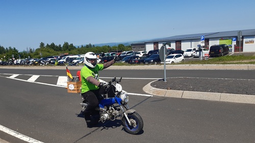 Tanken durften wir dann doch noch, der Tankwart konnte zwischen Arschlöchern und echten Mopedfahrern differenzieren. Die letzten 40 km waren für uns dann ein Klacks. Im Ziel haben wir uns die Wimpel abgeholt.