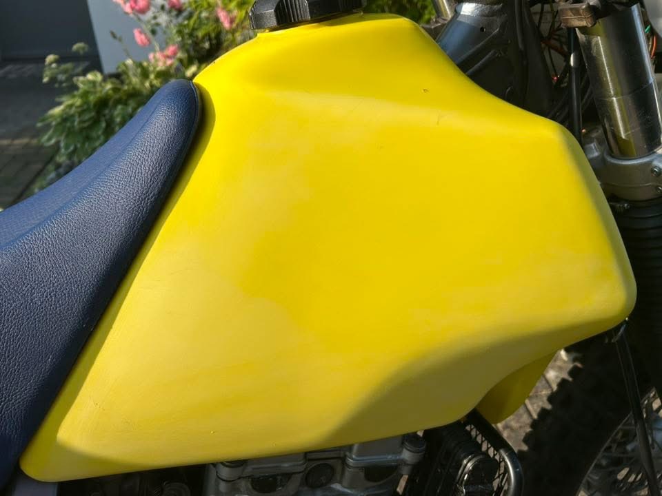 Ist meine Suzuki DRZ 250, Aufkleber halten überhaupt nicht, der Tank dünstet dermaßen aus, die runtergezogenen Aufkleber stinken Tage später noch nach Sprit.