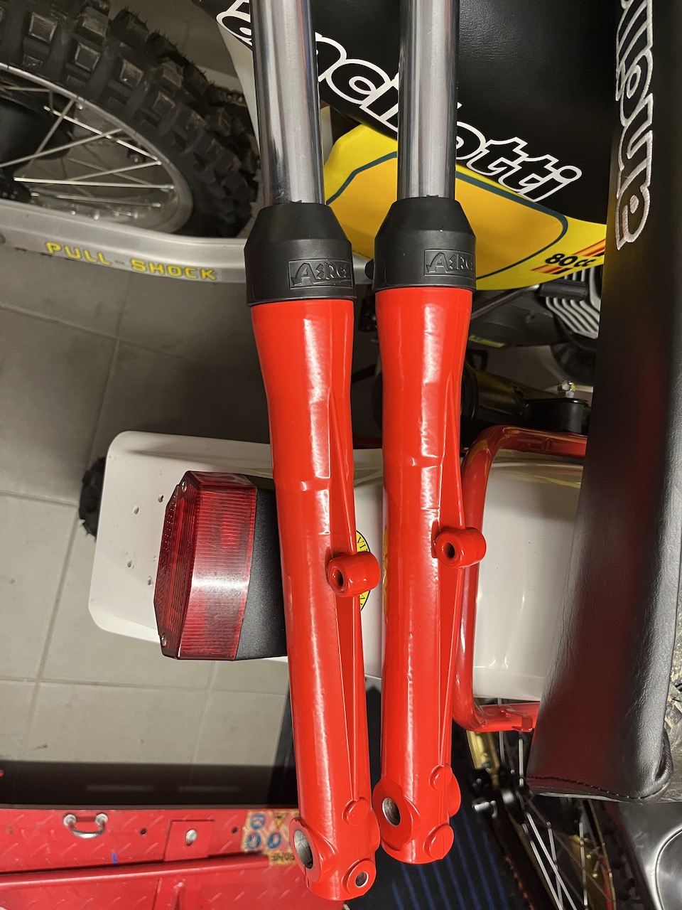 beide Bremsen sind fertig und neu belegt, Lenkkopf mit neuen Lagern versehen und eingebaut -suche leider noch das passende Schloß- Gabel wieder zusammen- und eingebaut, Lenker montiert, die Lenkerbefestigung habe ich letztes Jahr in Novegro gefunden, weiß zwar nicht, ob sie zu dem Modell gehört, ist mir aber egal.