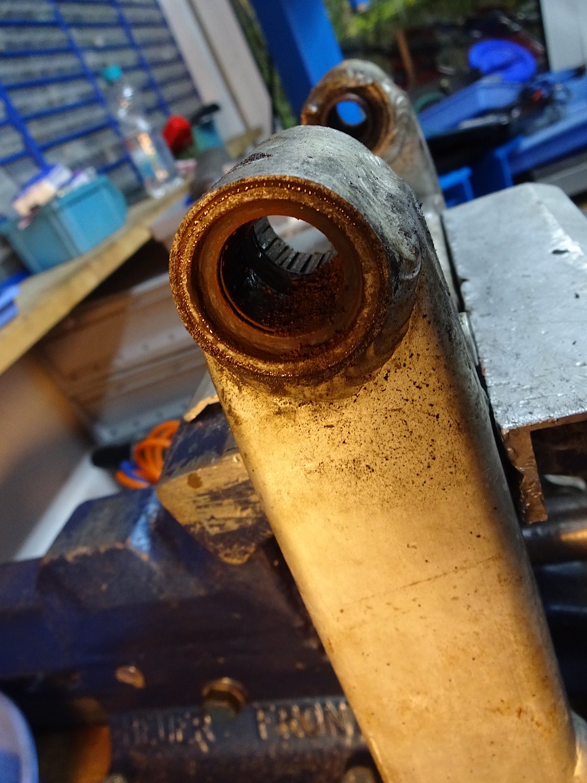 Achsen und Kettenspanner sind schwer verrostet, gingen aber einwandfrei zu zerlegen. Sogar noch Fett auf der Achse