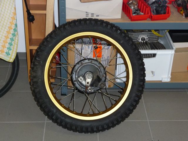 Zwischenzeitlich wurden die Speichen mit Dremel und per Hand bearbeitet, mit der Vorderradfelge war ich ganz zufrieden, bei der hinteren Felge habe ich rostbedingt überhaupt kein Land gesehen, so daß dann beide Felgen komplett neu eingespeicht wurden. Schade um die vielen Stunden...