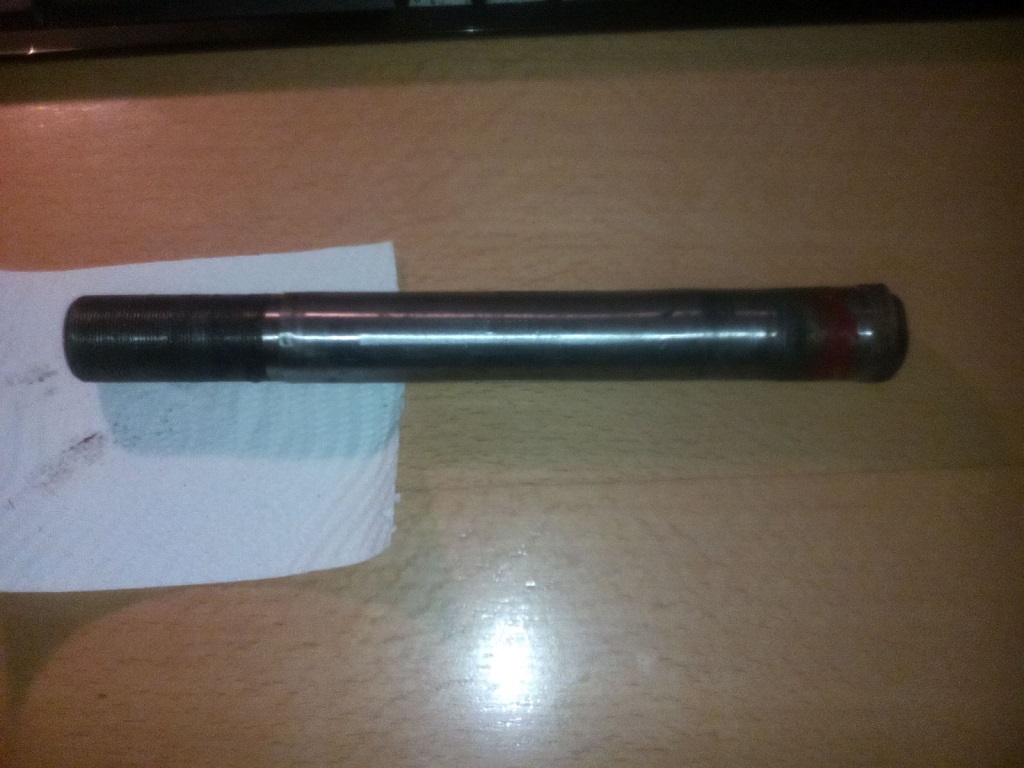Danach kommt ein blankes Stück von ca.4mm. Dann ist ein Absatz ins Rohr gedreht und es hat ab da einen Durchmesser von 26mm. Der Bereich ist ca. 135mm lang, danach ist es wieder abgesetzt und hat im Bereich der unteren Klemmung in der unteren Gabelbrücke einen Durchmesser von ca. 27mm. Der Bereich ist ca. 28mm lang, danach noch ein Absatz und das Rohr hat einen Durchmesser von ca. 28mm, ca. 10mm lang einschließlich einer Fase.